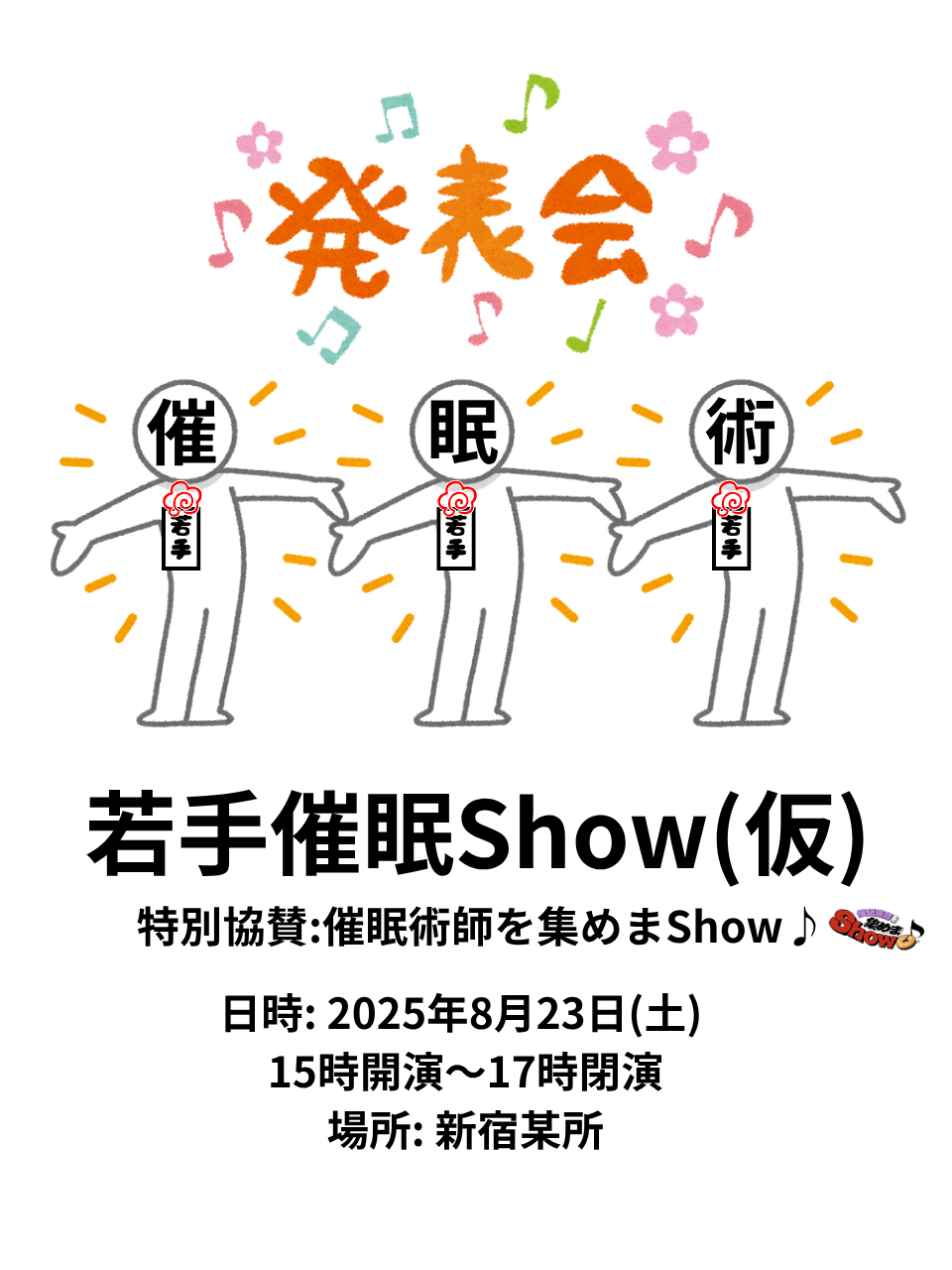 若手催眠Show(仮) 特別協賛:催眠術師を集めまShow♪ 2025 6/12 お知らせ 2025年6月12日 日時:2025年8月23日(土)15時開演~17時閉園場所:新宿某所 お知らせ よかったらシェアしてね! URLをコピーしました! URLをコピーしました! Hello world! テスト01 この記事を書いた人 paypay1234 関連記事関連する記事はまだ見つかりませんでした。 コメント コメントする コメントをキャンセルコメント ※ 名前 ※ メール ※ サイト 次回のコメントで使用するためブラウザーに自分の名前、メールアドレス、サイトを保存する。